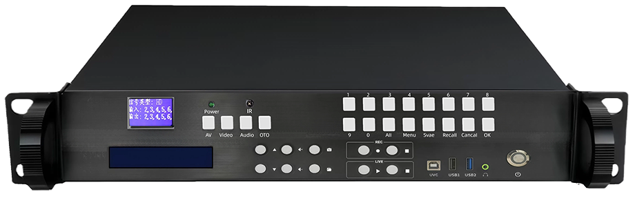 前面板有 LED显示屏;有多功能按键,不仅可任意分配输入、输出通道,而且可以通过上下按键翻页,音量加减控制输出音量,抓图按键抓取电影实时画面并保存,文件按键进入本地文件管理页面,还有录制/直播控制按键。