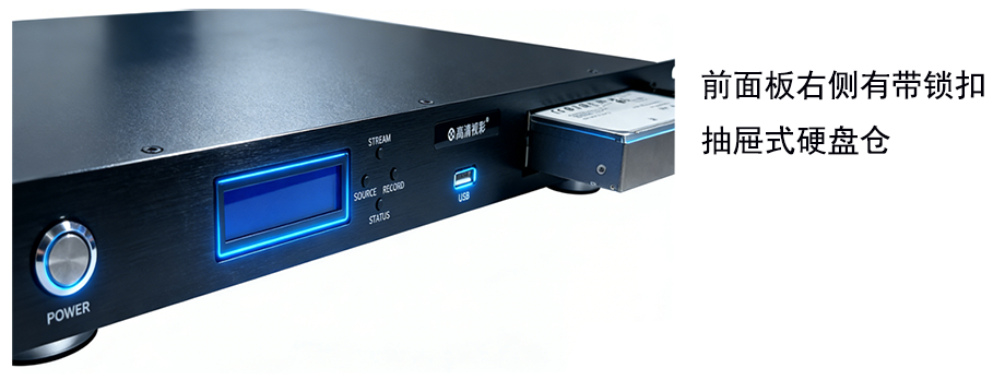• 存储方案:内置1个抽屉式SATA硬盘位,最高可支持16TB大容量硬盘。同时支持外接USB移动硬盘进行同步或备份录制。