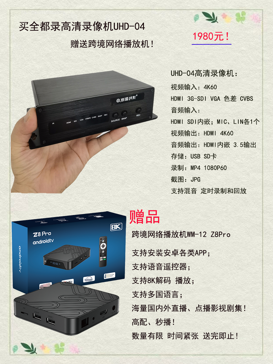 特大好消息! 购买UHD-04高清录像机,赠送跨境网络播放机一台! 数量有限,送完为止! 本次活动仅支持在公司官网直销商城下单购买,或者微信直接联系购买!