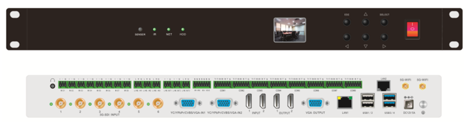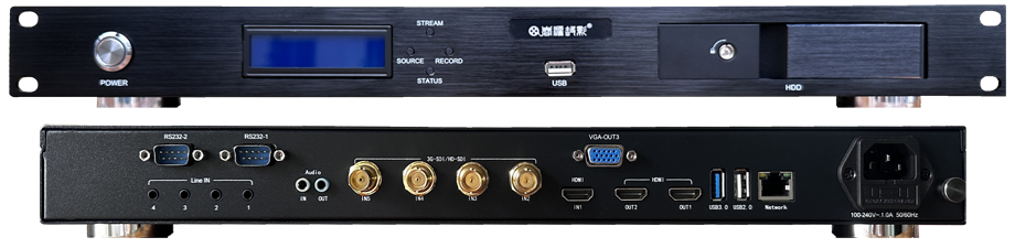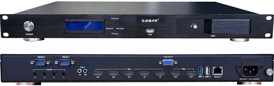 支持2路HDMI、2路SDI、5路网络信号输入录制。支持4K30、1080P60输入。支持网络POR供电。支持音频幻象供电。支持共同混音录制。支持SIP/H323协议,内置MCU,可拉流视频会议终端设备网络信号呼叫录制。支持抽屉式插入一块8TB大容量3.5寸SATA硬盘。支持开机自动录制、暂停录制、随时一键录制、定时预约录制、设置时长录制、按文件大小录制。支持本机、浏览器、客户端以及中控操控。