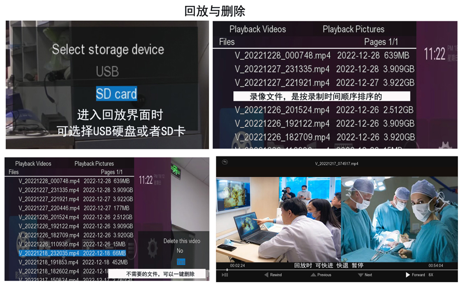 可选择视频或者图片播放;支持一键进入U盘或者SD卡的录制文件列表,可以预览播放或者一键全屏播放。可快进、暂停播放;可一键删除文件。 ![]()