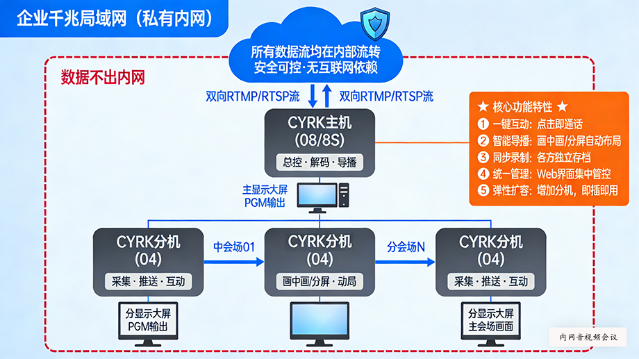 • 数据不出内网:所有音视频流均在自有局域网内流转,杜绝商业机密、技术资料通过互联网泄露的风险。