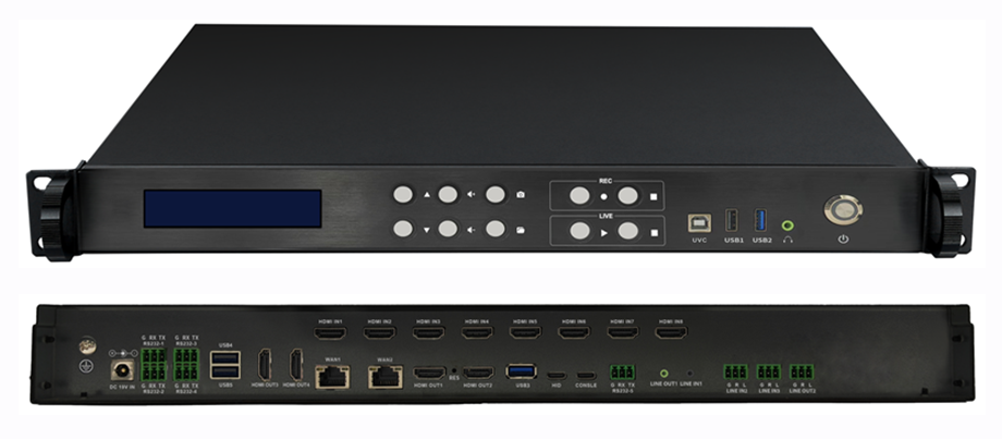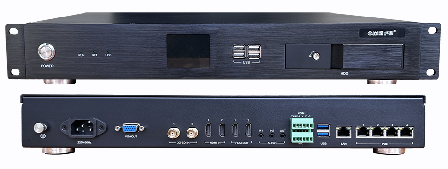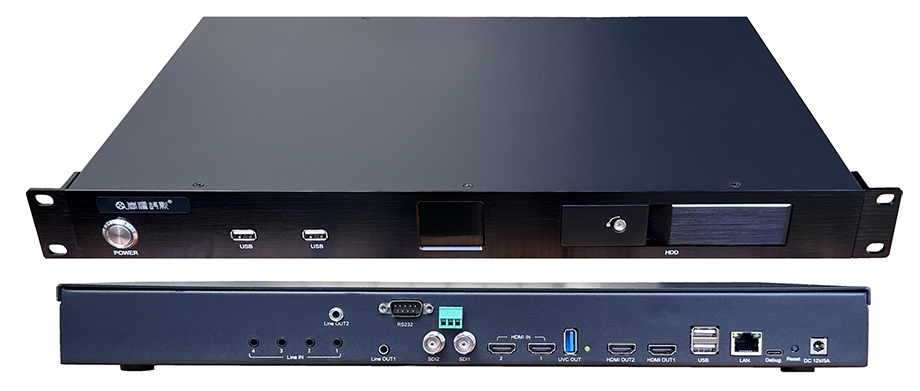 支持2路HDMI、2路SDI、5路网络信号输入录制。支持4K30、1080P60输入。支持网络POR供电。支持音频幻象供电。支持共同混音录制。支持SIP/H323协议,内置MCU,可拉流视频会议终端设备网络信号呼叫录制。支持抽屉式插入一块8TB大容量3.5寸SATA硬盘。支持开机自动录制、暂停录制、随时一键录制、定时预约录制、设置时长录制、按文件大小录制。支持本机、浏览器、客户端以及中控操控。