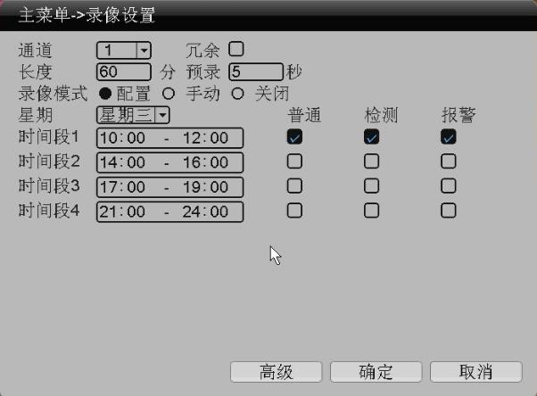 (2)、定时预约录制;每个通道每天可设置4个定时预约录像时间段。