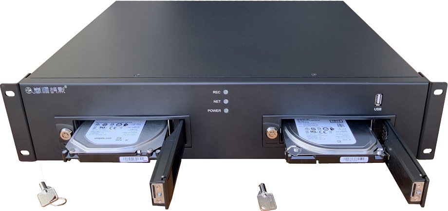 用钥匙打开两个硬盘仓,可分别置放进入3.5寸SATA硬盘,锁上仓盖即更换好硬盘;录制满后,可关机更换新硬盘。可设置录制满自动停止,也可设置覆盖录制。还可以设置两块硬盘冗余录制,既两块硬盘录制同样的内容,对重要场合录制,资料保存更有保障。以输入1080P60高分辨率计算,单通道每小时占用硬盘空间1.8G左右,6T硬盘,可以连续录制4个多月。如果要保持常年录制资料,可以换硬盘即可。有录制资料的硬盘,需要播放时,再插入该录播机即可播放。